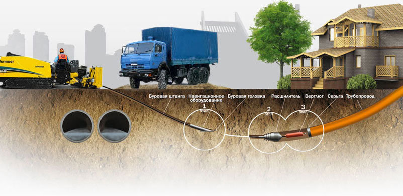- Расширяют скважину до диаметра, в 1,5 раза превышающего сечение трубопровода.