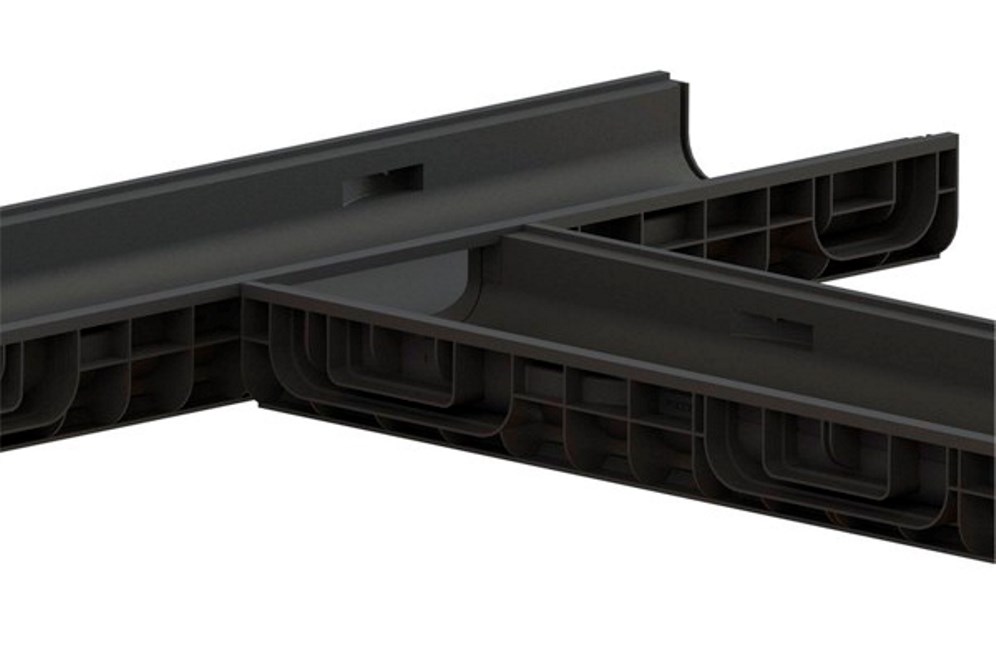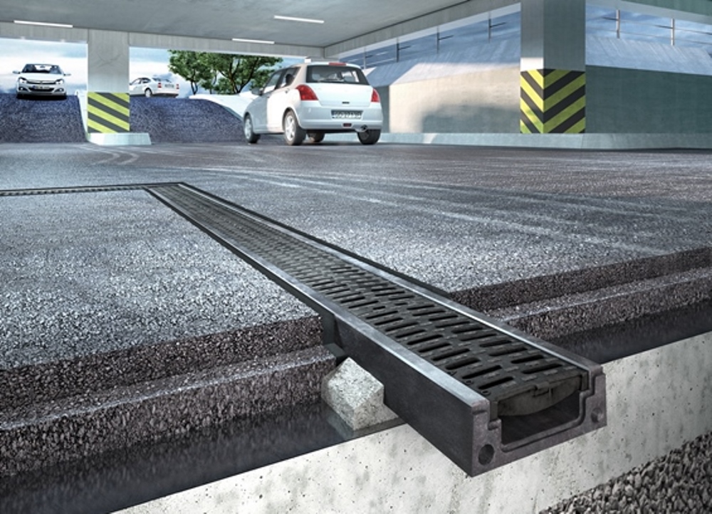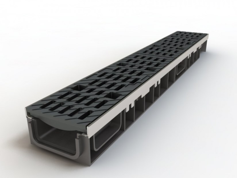 Изделия из полимеробетона сочетают в себе качества бетона и пластика. По жесткости и прочности они не уступают железобетону. Для производства этого материала в бетон добавляется гранитная крошка и песок, а так же эпоксидная или полиэфирная смола. Это позволяет в двое снизить вес изделий и сделать их более эластичными и гибкими, снизить коэффициент водопоглощения. Гладкая внутренняя поверхность способствует удалению из лотков мусора. Эти изделия часто используют для монтажа систем водоотвода у городских жилых домов, на автостоянках, дорогах, спортивных площадках, парках. По прочности полимеробетон может достигать класса F 900.