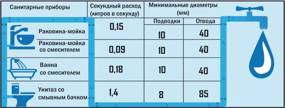 Каждый сантехнический прибор потребляет конкретный объем воды. Чтобы проще выполнить вычисления, я использовал в расчетах условную единицу. Ведь она позволяет обозначить определенное количество воды без привязки к конкретным цифрам.