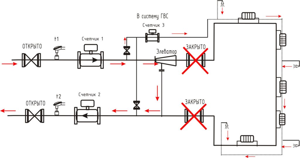 . Эта схема используется весной и осенью, при сравнительно низкой (до 80 градусов) температуре теплоносителя в прямой нитке теплотрассы; - Из обратки в обратку.