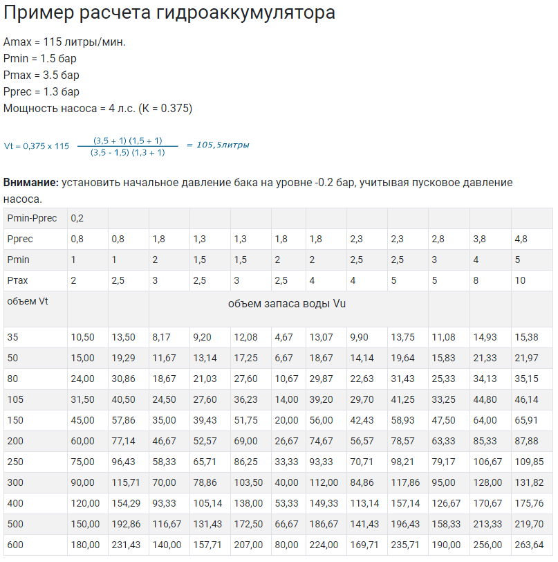 Если аккумулятор требуется для компенсации нехватки воды в пиковые периоды, чтобы рассчитать объем агрегата, применяют специальные формулы. Они учитывают производительность и коэффициент мощности напорного оборудования, расход воды, водяное и воздушное давление и другие параметры. Вариантов много, и точно определить нужный показатель может только человек, который хорошо умеет считать.
