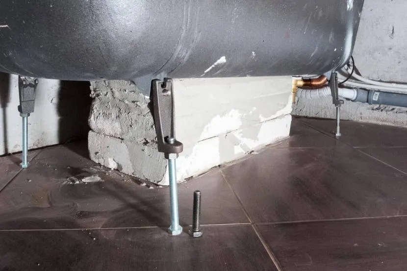 - Для защиты напольного покрытия от проседания под ножки ванны устанавливают прокладки из металла толщиной не менее 5 миллиметров.
