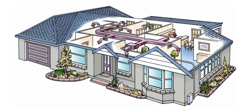 Здесь действует тот же рекуператор, но гораздо больших размеров и система вентиляционных каналов охватывает уже весь дом. Т.е. система вентилирования является полностью принудительной. Даже, если вы не будете открывать окна и двери, система будет вентилировать все помещения автоматически. Несомненным плюсом такой системы является возможность объединить функции вентиляции и кондиционирования воздуха.