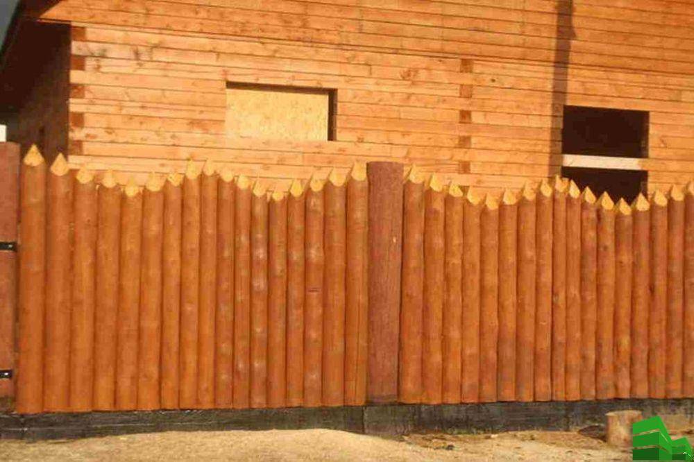 Бревенчатая. Основным элементом данной конструкции являются бревна, располагающиеся стоя или лежа. Соединяют бревна в единую конструкцию брусья со специальными выемками. Данный вид ограды из дерева является дорогим удовольствием, требующим дорогого ухода.