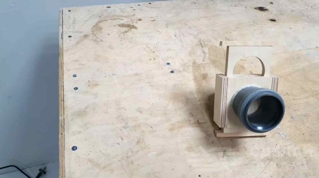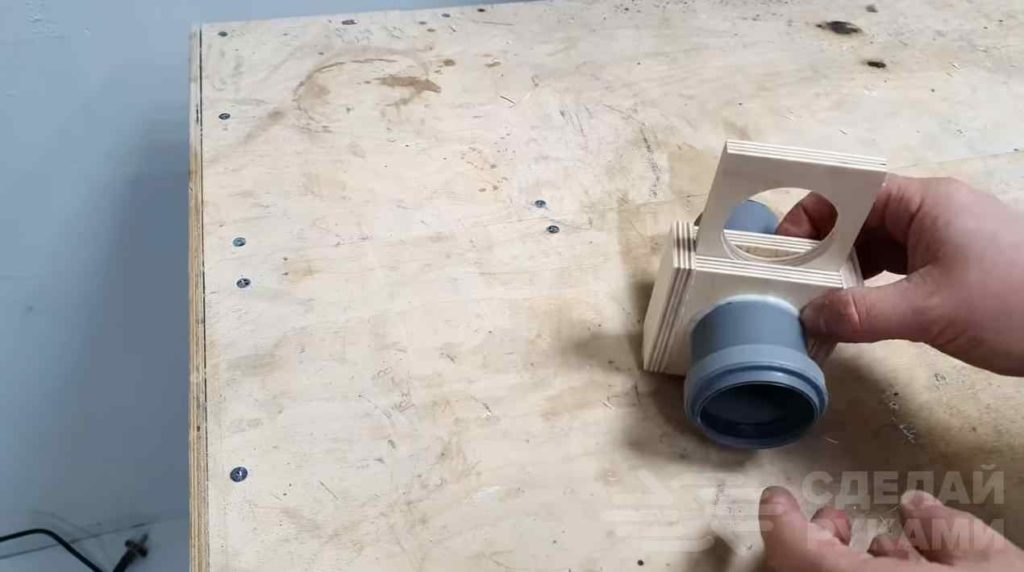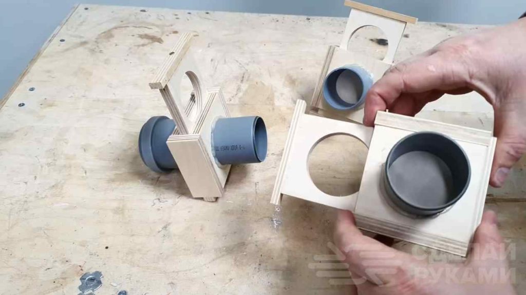 На следующем этапе вклеиваем отрезки пластиковой трубы в квадратные заготовки из фанеры. При помощи двух брусочков соединяем друг с другом части корпуса задвижки.