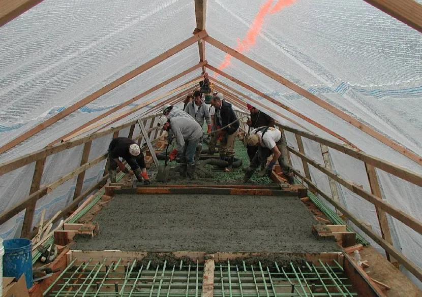 Чтобы созревание бетона проходило согласно строительным нормам, и мороз не нарушил верхний слой, его нужно укрыть накрывающей после заливки: тентом или пленкой ПВХ. Используют также древесные опилки или другие материалы для сохранения необходимой температуры при застывании бетона. Для удобства применяют опалубку, которую разбирают весной или в условиях, когда набору прочности бетона не будут угрожать отрицательные температуры.
