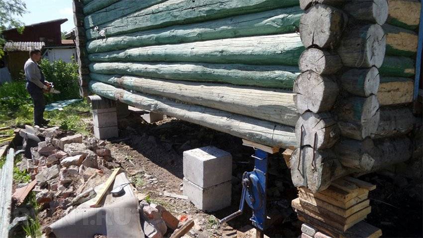 - С помощью домкратов, упирающихся в верхние бревна перевязки венца, приподнимают сруб на 7 — 10 см.