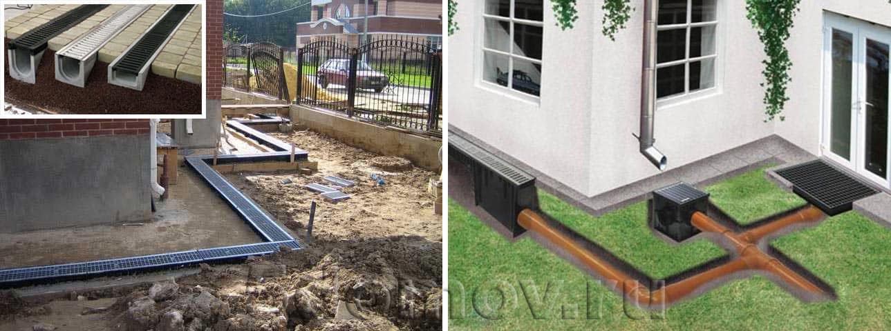 Проведение геодезической разведки на участке, даст возможность узнать тип грунта и глубину залегания грунтовых вод. Если земельный участок находится в низине, а ландшафт с уклоном, то сооружения будут находиться на пути следования талых и дождевых вод. В таком случае организуется поверхностный тип водоотведения. Сооружаются наземные каналы из пластмассовых, композитных либо бетонных желобов. Эти системы соединяются с ливневой канализацией. Инфильтрационные потоки, попадая в желоба, будут отводиться в систему городской канализации. Если такой возможности нет, то следует выкопать перепускной колодец.