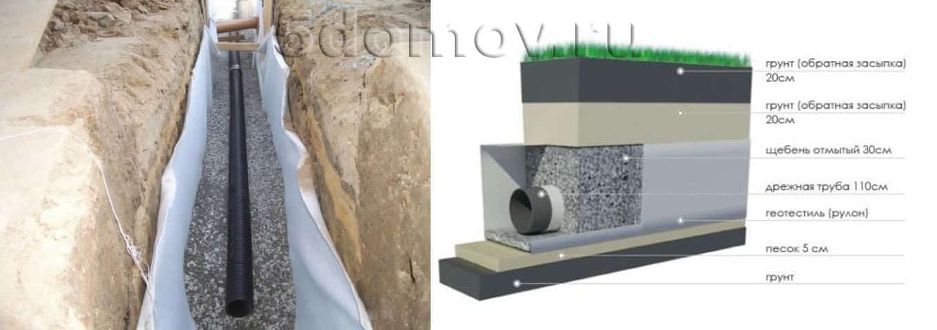 При высоком уровне грунтовых вод, по периметру участка прорываются траншеи для прокладки системы труб (дрен). Дрены прокладываются ниже глубины промерзания почвы на 30-40 см. Траншея копается глубже для обустройства фильтрационного слоя щебня. Для фильтрации подземных вод, трубы с засверленными отверстиями можно обвернуть геотканью.