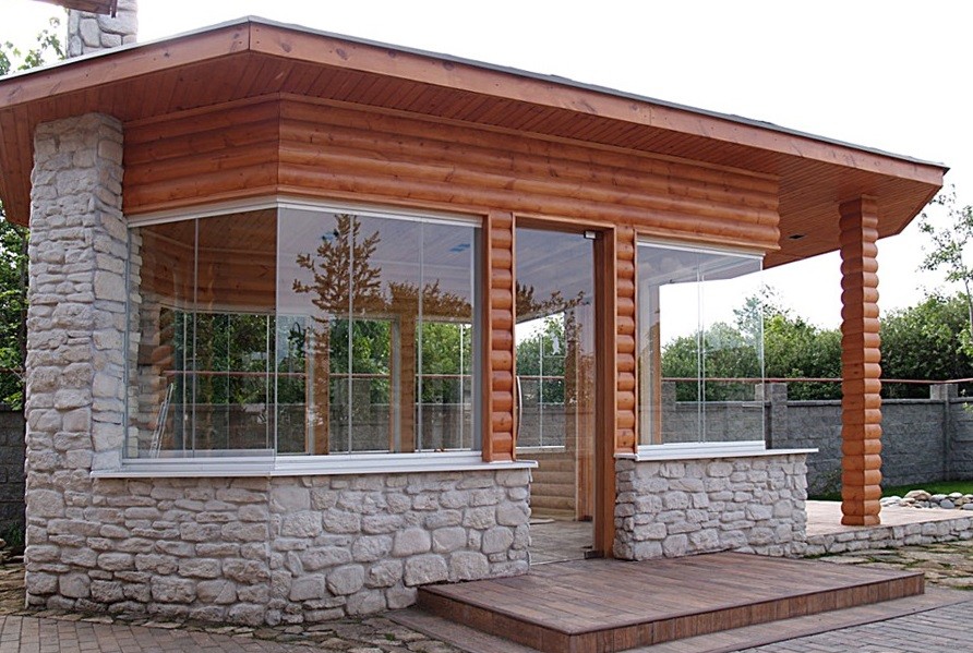 В настоящее время безрамное остекление является элитным вариантом в дизайне. Подходит этот стиль для беседок и веранд любой формы строения, ведь он повторяет любые контуры фасада. Без вертикальных стоек фасад строения останется неприкосновенным, а открыть окна в хорошую погоду не составляет труда. Также этот способ создаёт отличный панорамный вид.