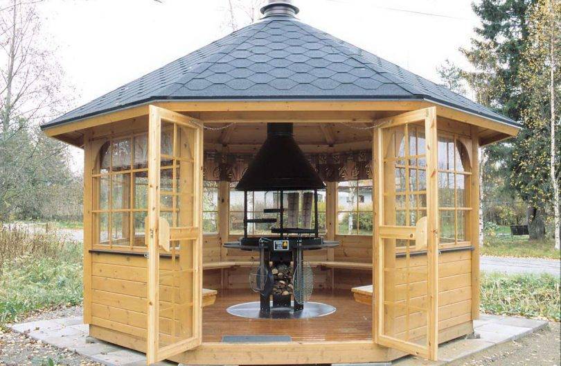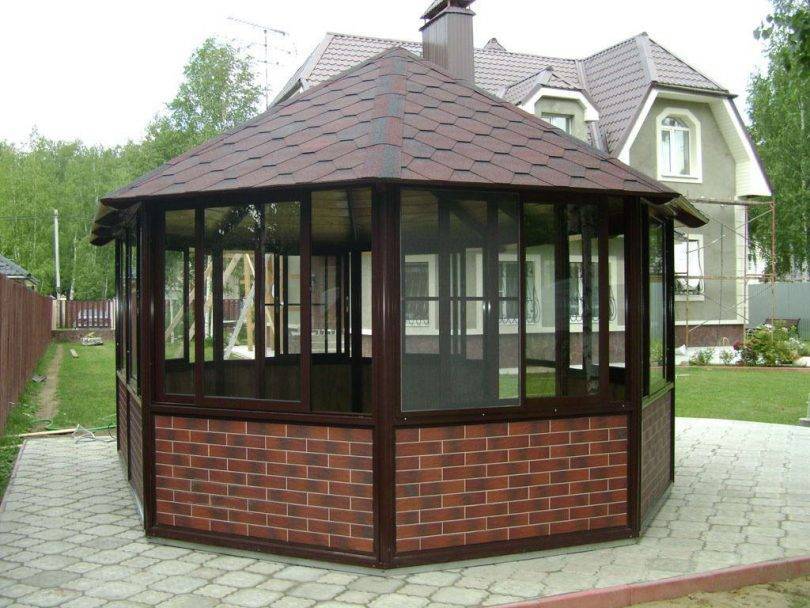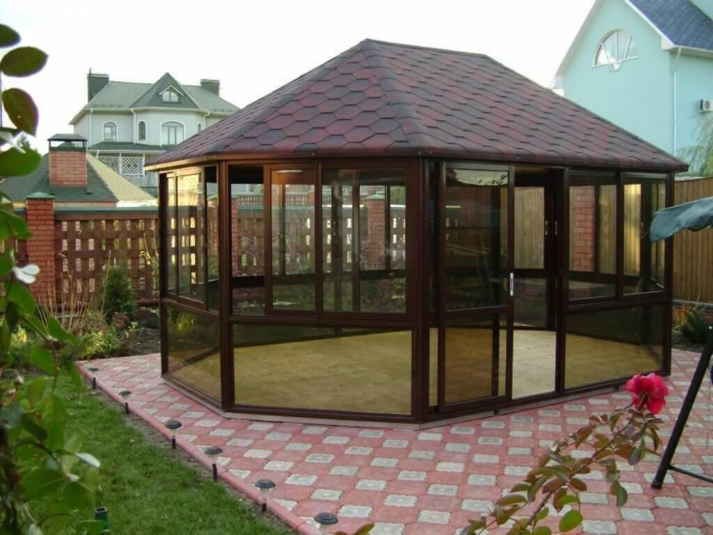 Для беседки, которая будет использоваться только летом и осенью будет достаточно холодных однокамерных или бескамерных окон. И предпочтительнее, чтобы они были с алюминиевым профилем. Самое главное преимущество такой конструкции перед пластиком и деревом – малый вес в сочетании с прочностью и пожаробезопасностью. Конечно, теплозащита окна тут будет минимальной, но в данном случае этого и не требуется. На фото внизу – восьмигранная беседка с раздвижным остеклением окон.