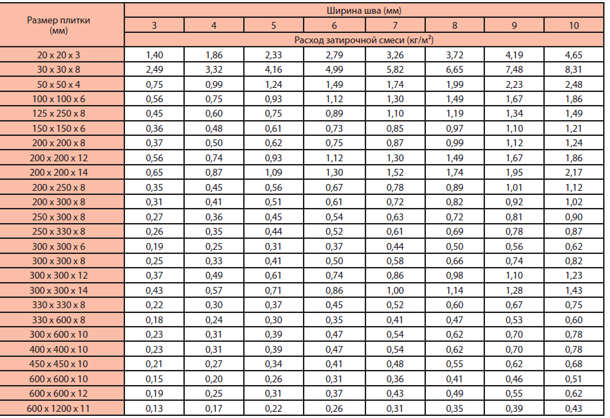 Вес затирочного состава определяется как произведение объема пустот на плотность вещества. Также воспользуйтесь специальными справочными таблицами под кафель со стандартными размерами. На величину расхода также влияет то, как был подготовлен шов, удален ли из него клей.