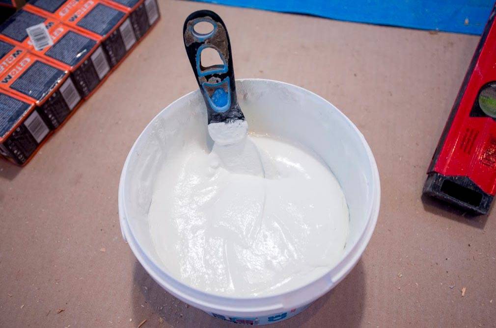 Сухую смесь разводят водой до густоты жирной сметаны. Зачерпывают стальным шпателем готовый состав.