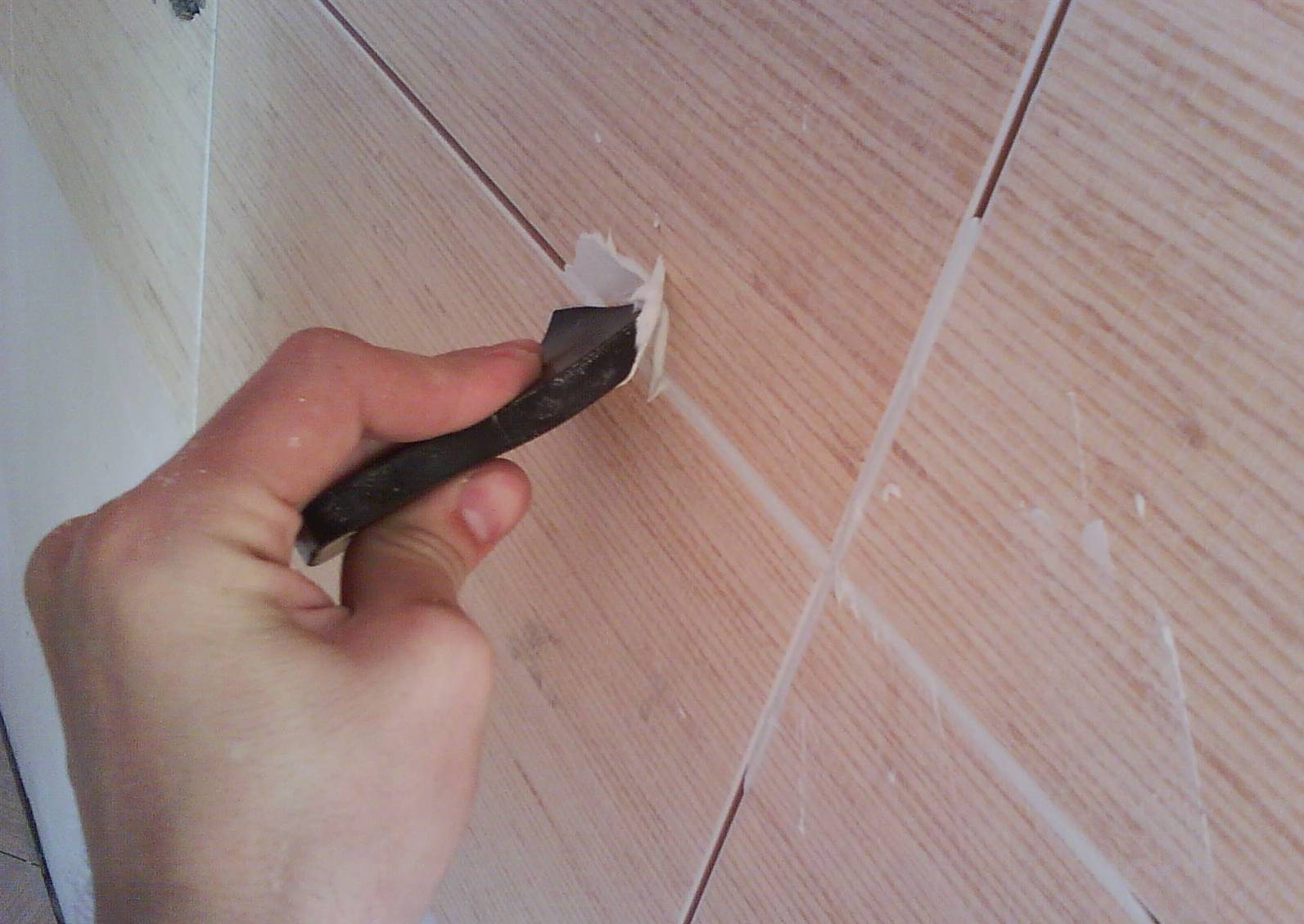 - Извлечение из шва размокшей массы производится шабером или любым подручным инструментом, подходящим для решения данной задачи (отвертка, гвоздь). Для этого нужно провести инструмент по шву и аккуратно убрать старую смесь, при этом не повредив керамическую поверхность. Также существует способ удаления смеси из стыков болгаркой, это более грубый способ. При работе с электроинструментом швы размачивать не нужно. Для размягчения эпоксидных мастик применяется растворитель для эпоксидных смол, позволяющий частично удалить затирку. При использовании растворителя, промачивать нужно только место стыка, чтобы не испортить кафельную поверхность.