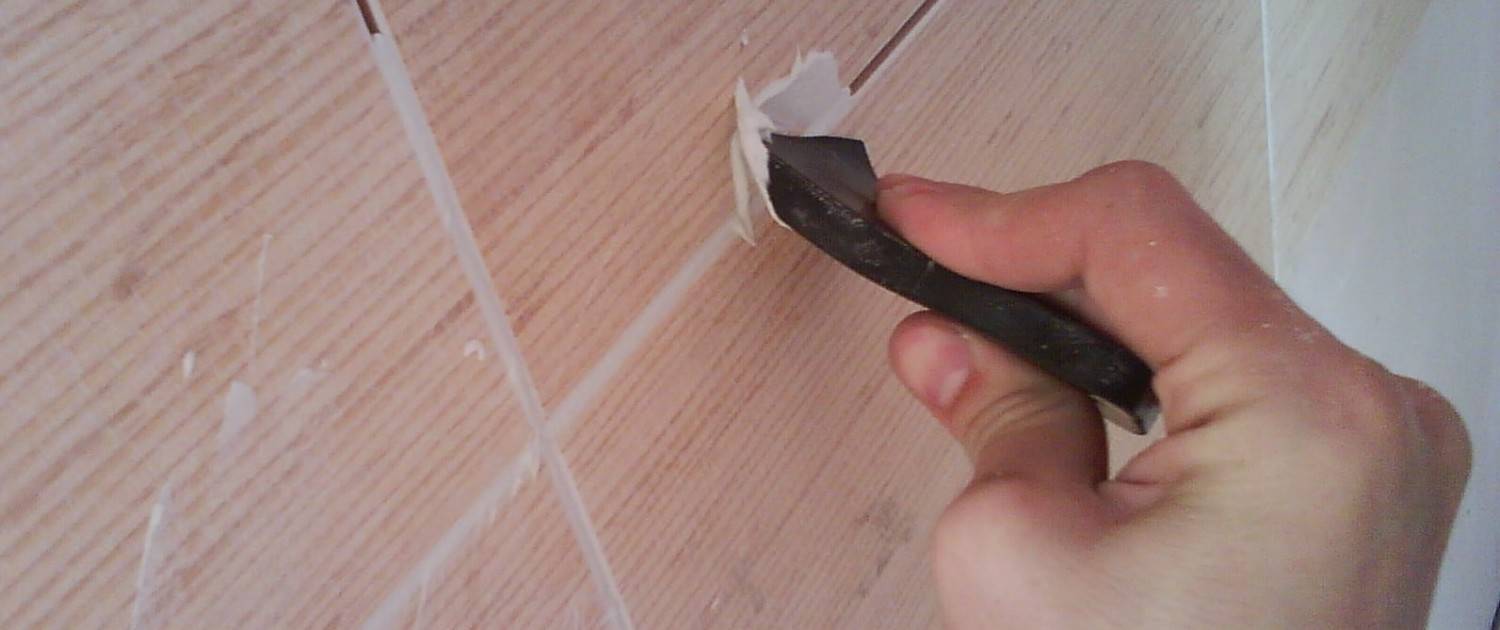 Внимание! При очистке швов, когда клей высохнет, следует проявлять большую осторожность. Если случайно прижать грань плитки с нагрузкой, которая противопоказана керамике, то вы сколете глазурь или даже вообще сделаете скол на грани кафеля. Поэтому следует избегать использования различных отвёрток, гвоздей или саморезов и производить такую очистку только тонким металлическим шпателем.