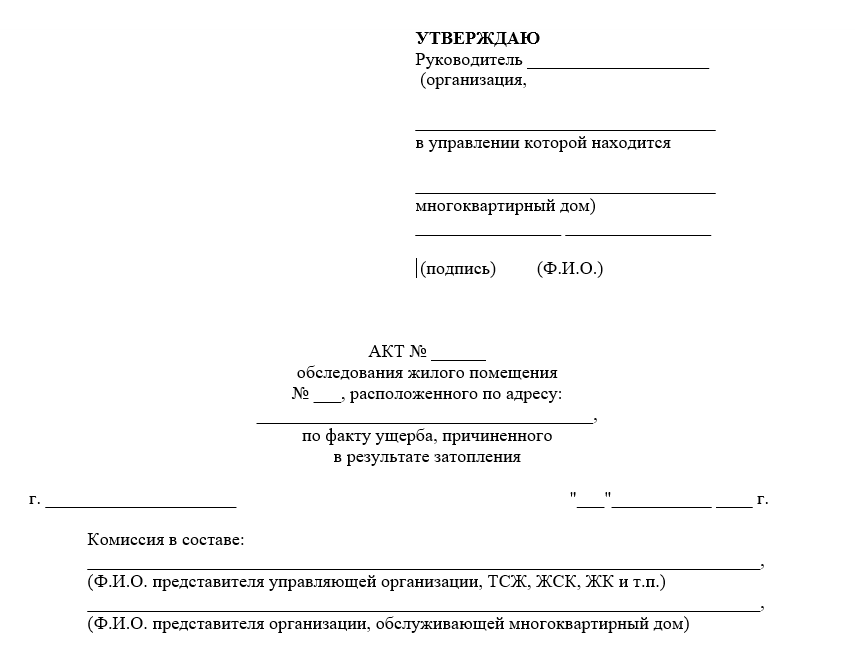 Форма акта произвольная, составляется и подписывается комиссионно. Проставляется дата составления акта и печать управляющей организации. В акте должны быть сведения: о собственниках, нанимателях затопленного жилого помещения и квартиры, в которой произошло протекание, о представителях управляющей организации, факты затопления и повреждения имущества, места и объемы затопления квартиры и повреждения имущества. Например, в квадратных метрах выражаются размеры повреждений потолка и стен, для поврежденного имущества указывается степень повреждения с описанием идентифицирующих признаков вещей. Акт подписывает сотрудник УК, собственник затопленной квартиры и виновник.