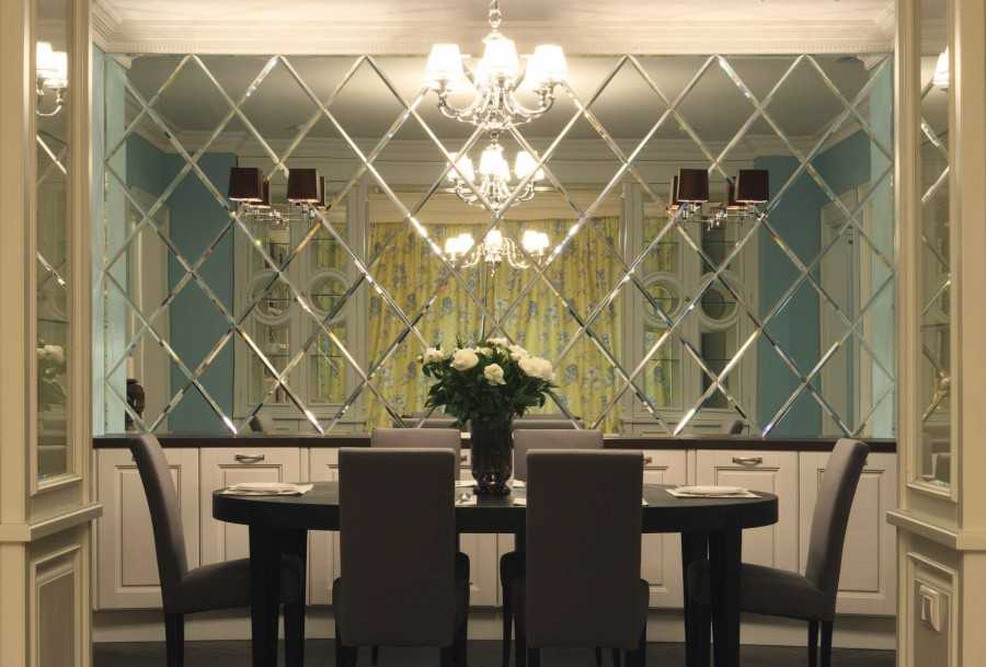 Зеркальная плитка с фацетом в интерьере гостинойИсточник sense-life.com