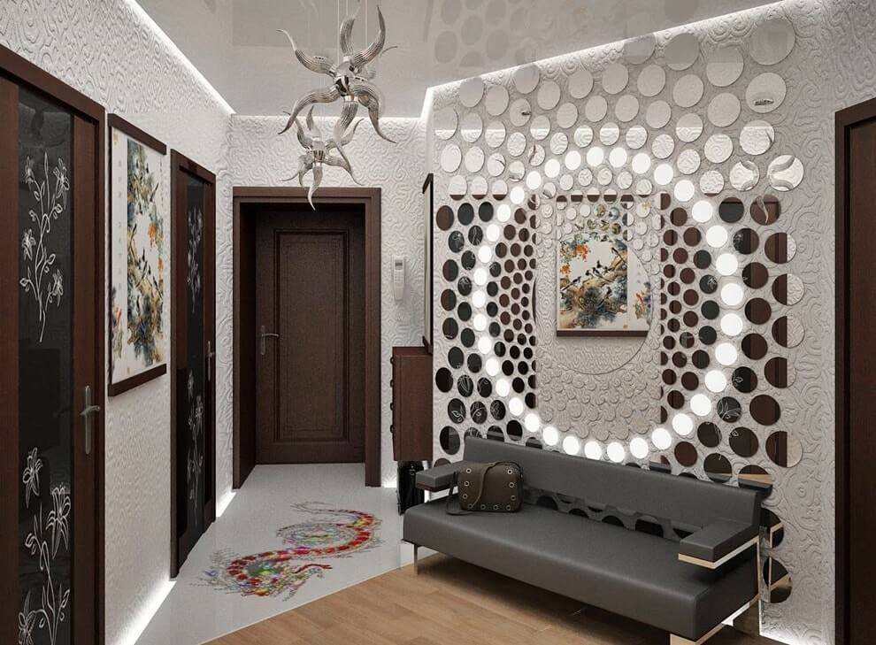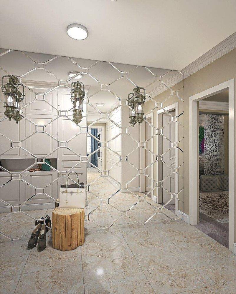 В прихожей зеркальная плитка будет уместна во входной зоне, там, где обычно помещают зеркало. Если прихожая узкая и длинная, не стоит облицовывать зеркальной плиткой короткую стену, особенно удаленную от выхода. А согласно фэн-шуй, зеркальная поверхность не должна располагаться напротив входной двери. Лучшее решение — участок сбоку от двери или на ближняя ко входу боковая стена, если она не слишком короткая.