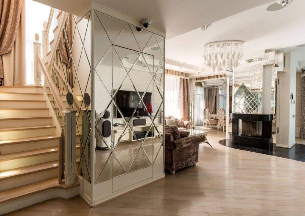 В просторном зале, где на одной из стен выполнена рельефная отделка, имитирующая арку, можно заполнить этот участок зеркальной плиткой для создания иллюзии прохода в другую комнату. Также интересно смотрятся облицованные зеркальной плиткой колонны, участок стены над камином.