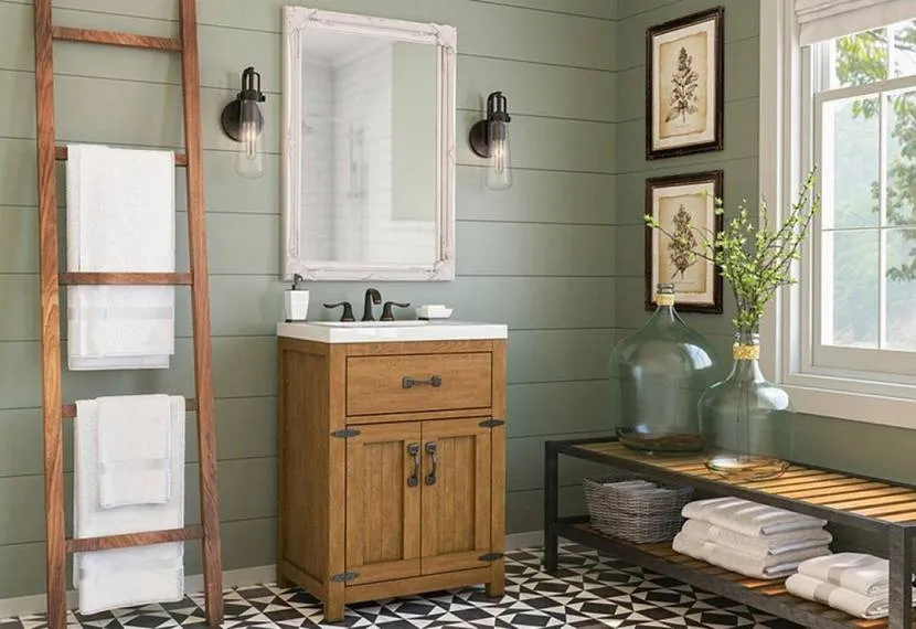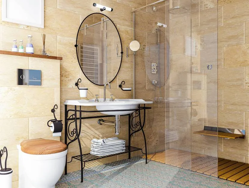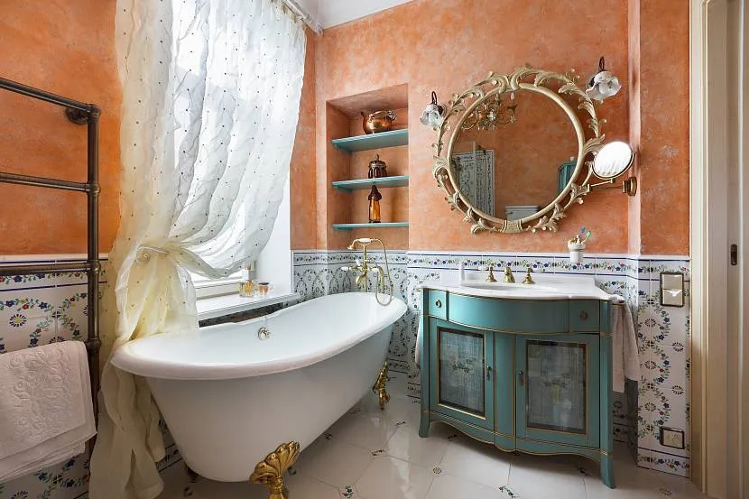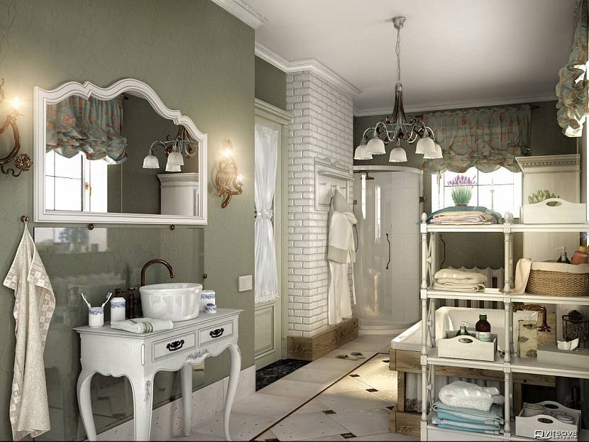 Говоря про кантри-стайл в дизайне интерьера ванной комнаты, отметим наличие множества различных декоративных элементов, которые придают особое настроение домашнего уюта и тепла. Зеркала в ванной комнате такого стиля обычно подбираются не очень больших размеров, а форма оказывается предпочтительно округлой, без прямых углов.