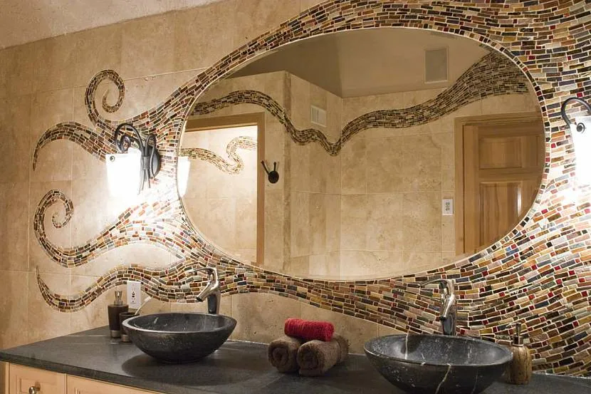 Обрамление можно сделать и без рамки: для этого зеркало надо вмонтировать в стену вровень с отделочной плиткой. Этот вариант открывает многочисленные возможности для дизайна: рамку можно выложить мозаикой, искусственным камнем, цветным стеклом, декоративным кафелем, витражными элементами и даже морскими ракушками. Существенный недостаток такого обрамления – сложность демонтажа. При необходимости замены зеркала или отделки достаточно проблематично удалить подобный декор и не повредить при этом настенную плитку и само зеркало.