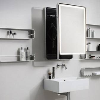 Зеркала с полками в ванную комнату лучше всего размещать над раковиной, чтобы удобно было брать мыльные принадлежности с полочек.