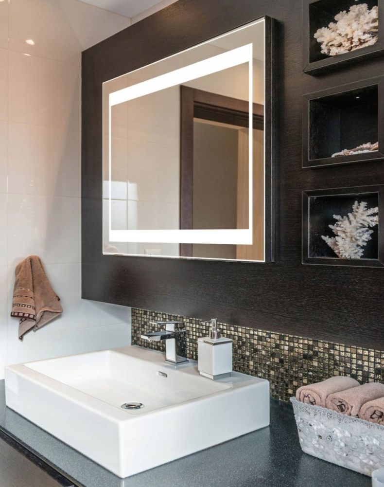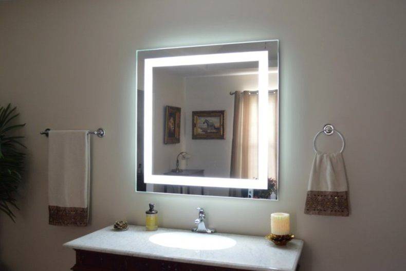 - Зеркало с подсветкой в ванную комнату – данная модель может быть оснащена как внутренним, так и внешним освещением в виде люминесцентных, неоновых, галогенных либо светодиодных лампочек.