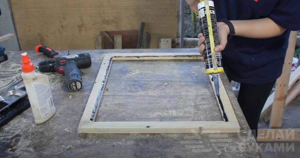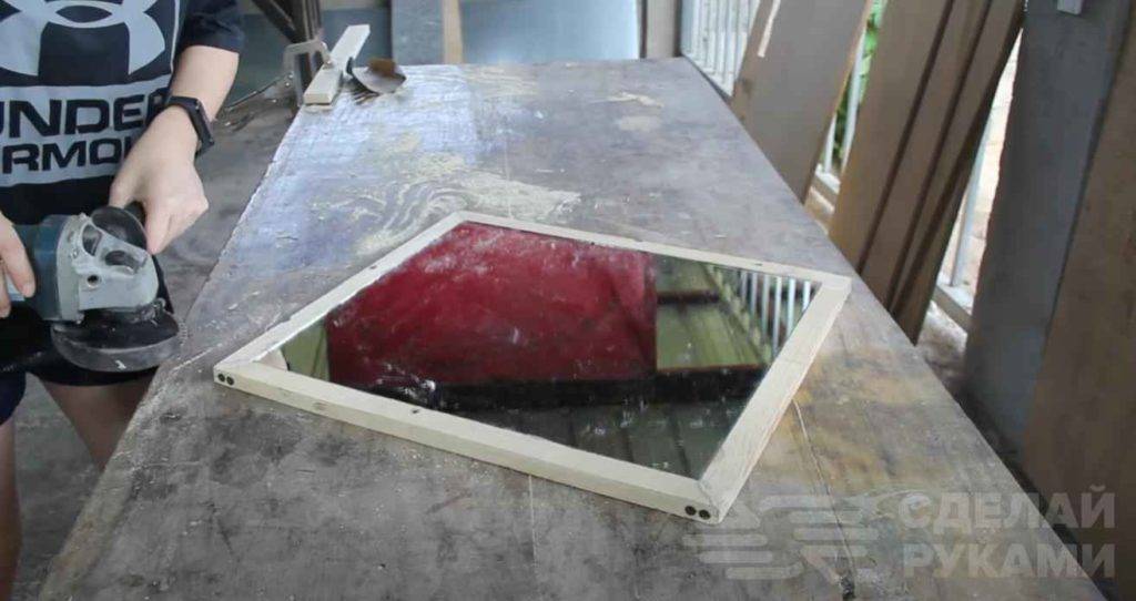К наружной стороне рамки приклеиваем зеркало. Потом необходимо отшлифовать места стыков и саму поверхность брусков.