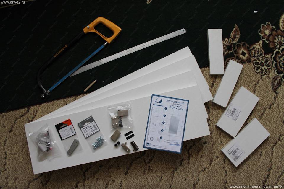 Что было куплено:1. Деталь мебельная ЛДСП, 800х200х16 мм, цвет белый.Цена 57р./шт. — 4шт.2. Полотно зеркальное, 35х70 смЦена 358р./шт. — 2шт.3. Подвеска мебельная 5.1а, 4 шт.Цена 24р./4шт. — 1уп.4. Держатель магнитный для одного стеклянного фасада MH01/WЦена 46р./2шт. — 1уп.5. Полкодержатель с борт. 5,0х16 никель (12 шт)Цена 18р./12шт. — 1уп.6. Петля мебельная для стеклянного фасада HG001/NiЦена 56р./1компл. — 2шт.7. Панель МДФ 7х238х2600мм Classic ясеньЦена 109р./шт — 1шт.