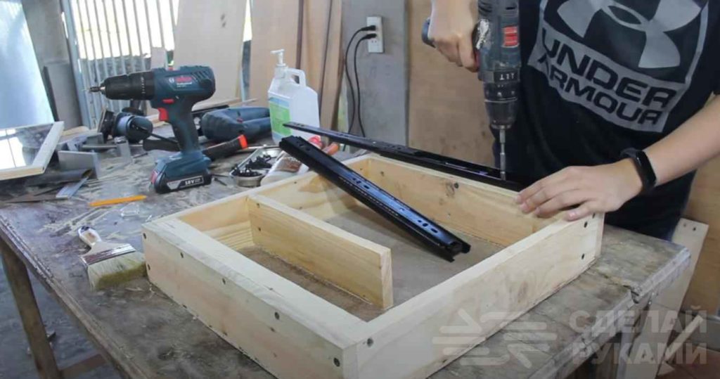 После этого можно приступать к сборке всей конструкции. К передней части корпуса надо прикрутить мебельные направляющие, затем — крепим к ним дверцу.