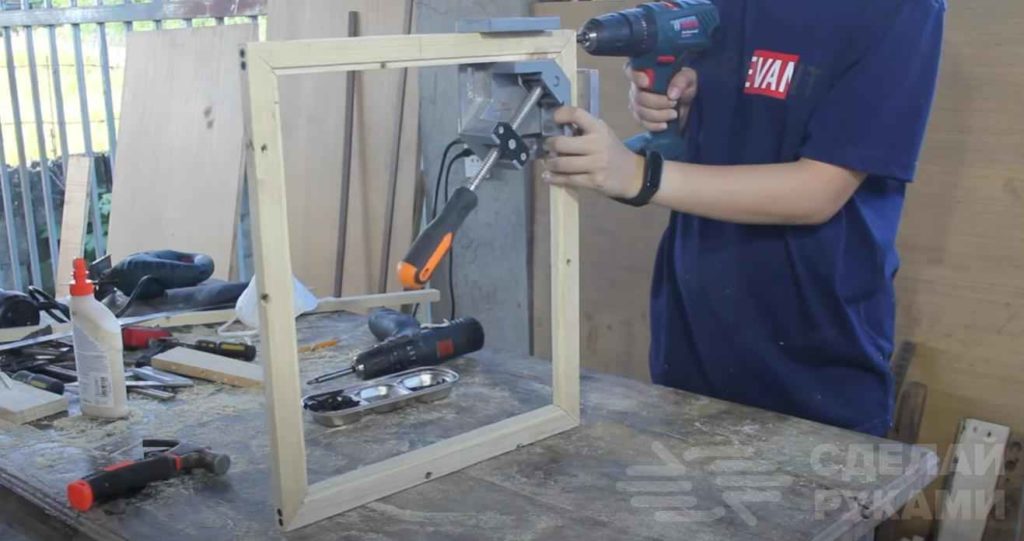 На следующем этапе приступаем к изготовлению дверцы. Отпиливаем четыре деревянных бруска, и собираем рамку.
