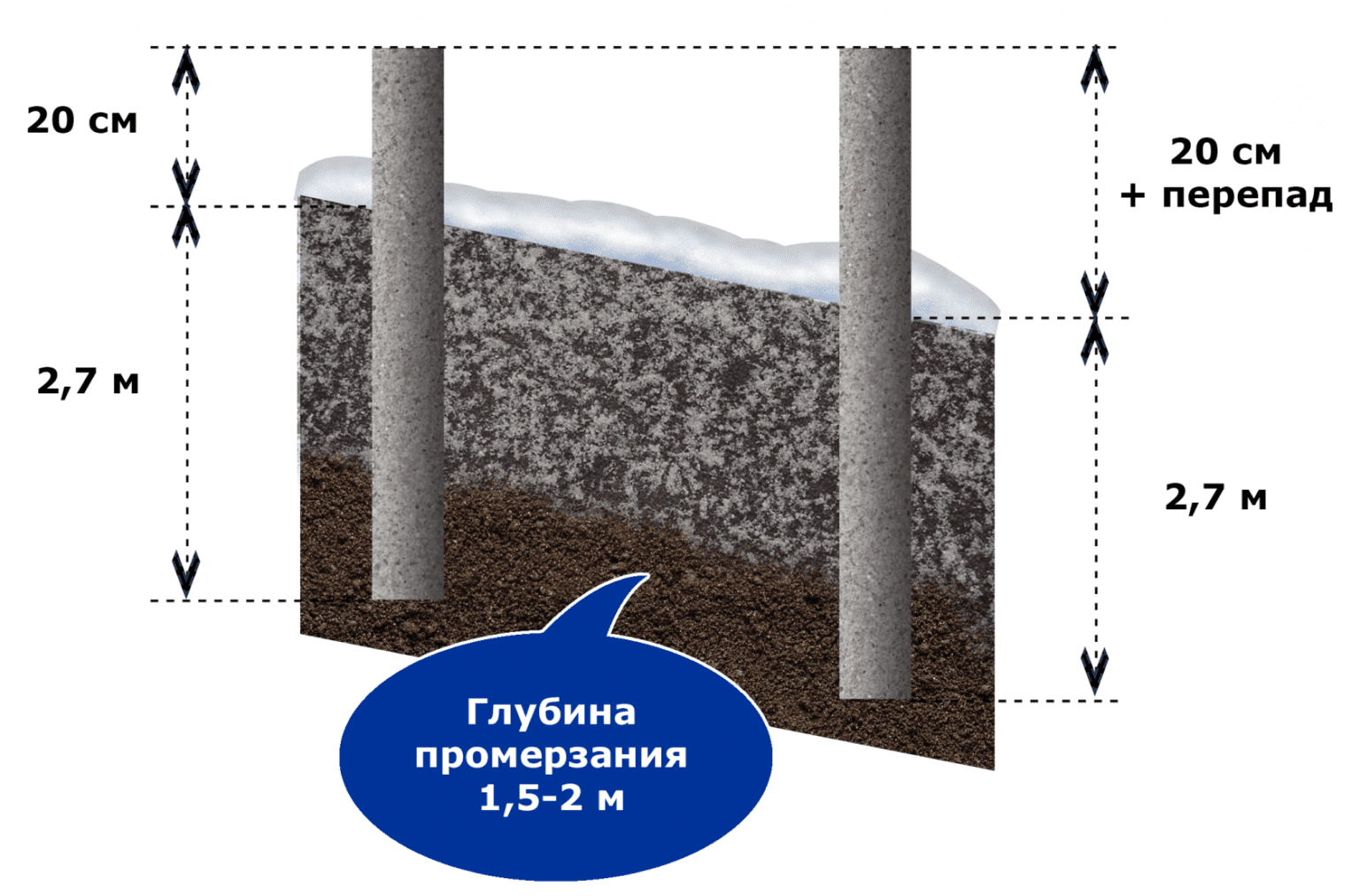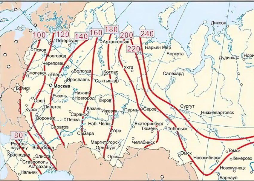 Глубина заложения трубопровода зависит от климатических условий в регионе и состава почвы на участке. Суглинки и глины промерзают меньше, чем пески или каменистые грунты Так, в Московской области эта величина находится в промежутке от 1,35 до 2 м, в Краснодарском крае — 0,3-0,5 м, в Сургуте 2,2-2,9 м.
