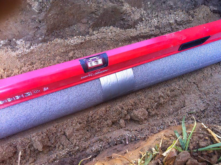При укладке нужно строго соблюдать обратный уклон не менее 0,001 в сторону колодца или точки врезки. На плоском рельефе его можно уменьшить до 0,0005.