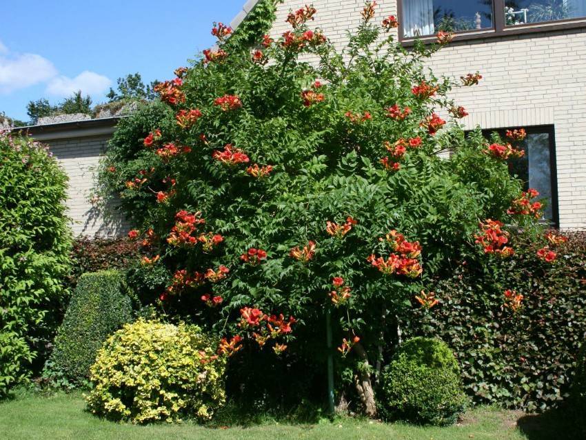 Лианы кампсиса разрастаются очень быстро, поэтому их лучше не садить прямо перед окнами дома.