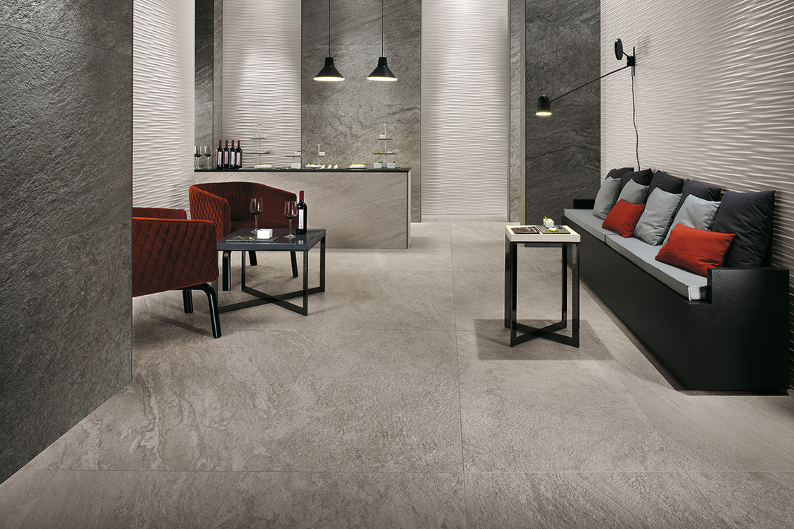 3. «Под бетон». Плитка, фактура и цвет которой напоминает бетон, набирает обороты популярности. Рельефная плитка будет отличным фоном для стиля hi-tech и лофт.